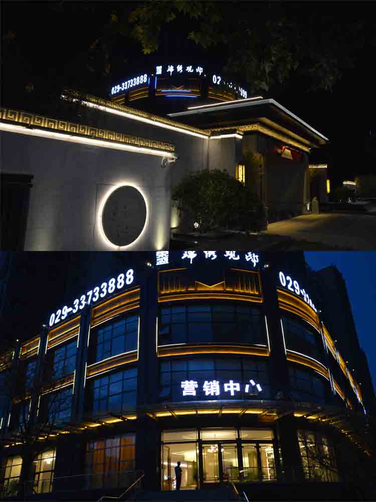 2018 榮盛景秀觀邸售樓部亮化,蘭光設(shè)計(jì)師根據(jù)其榮盛景秀觀邸售樓部商業(yè)屬性,商業(yè)照明設(shè)計(jì)明亮而醒目,營(yíng)造商業(yè)經(jīng)營(yíng)的夜景氛圍。以靜態(tài)的暖色燈光將其打亮,凸顯雅致?!皹s盛景秀觀邸”標(biāo)志以高亮度的燈光,吸引顧客注意,增強(qiáng)商業(yè)宣傳力度。景觀燈造型與建筑外立面造型完美融合,晚上光斑效果與綠植景觀交相輝映,相映成趣!榮盛景秀觀邸的亮化設(shè)計(jì)施工,獲得了客戶的高度認(rèn)可。